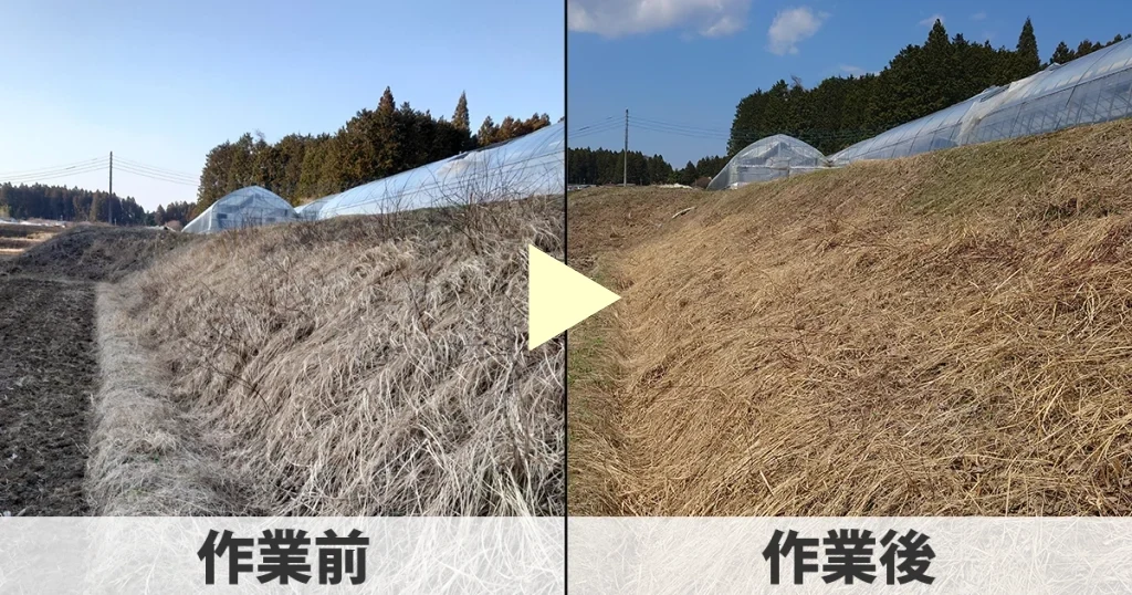 田んぼ回りの荒れた草の状態と借り終わった後の草の状態。